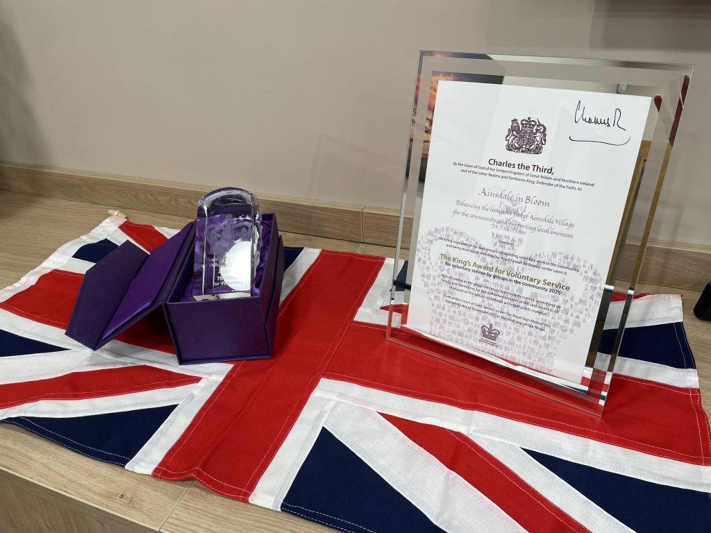Ainsdale in Bloom received their King’s Award for Voluntary Service on Friday 20th March on a beautiful spring day which amply showed off the uplifting plants and flowers in the planters around Ainsdale Village.