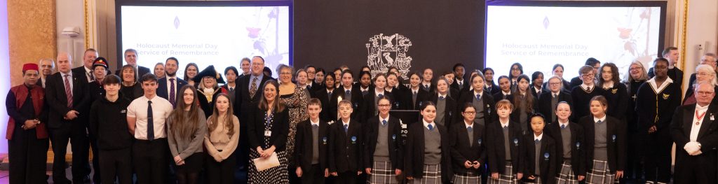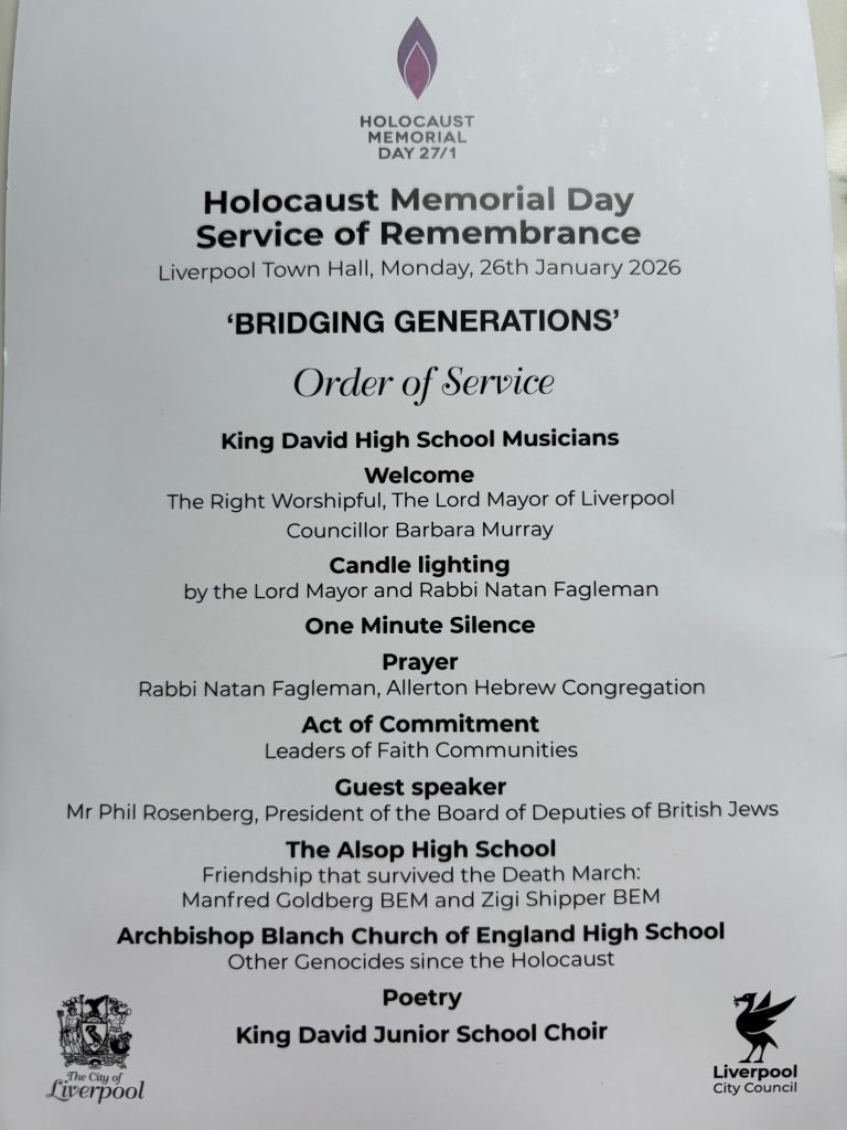 Dr. Hussey noted, “I was honoured to attend Holocaust Memorial Day at Liverpool Town Hall on behalf of the Lord-Lieutenant. The theme of ‘Bridging Generations’ illustrated through moving stories by students from Alsop High School and Archbishop Blanch Church of England High School. Thoughtful music and singing by King David school choir.”