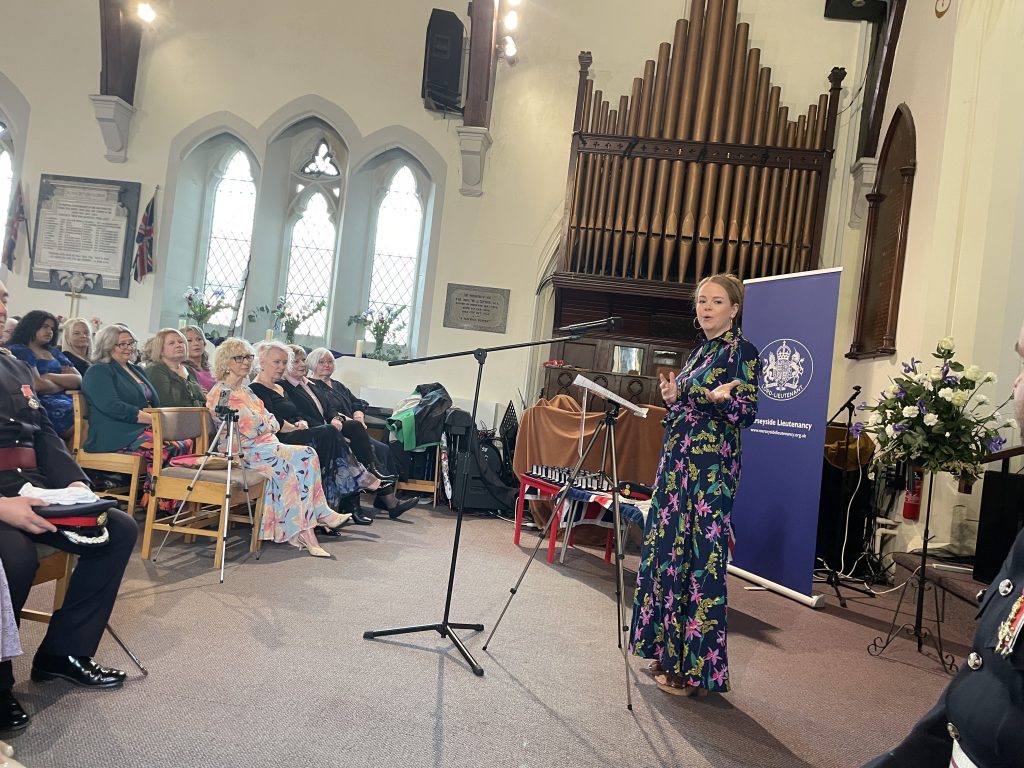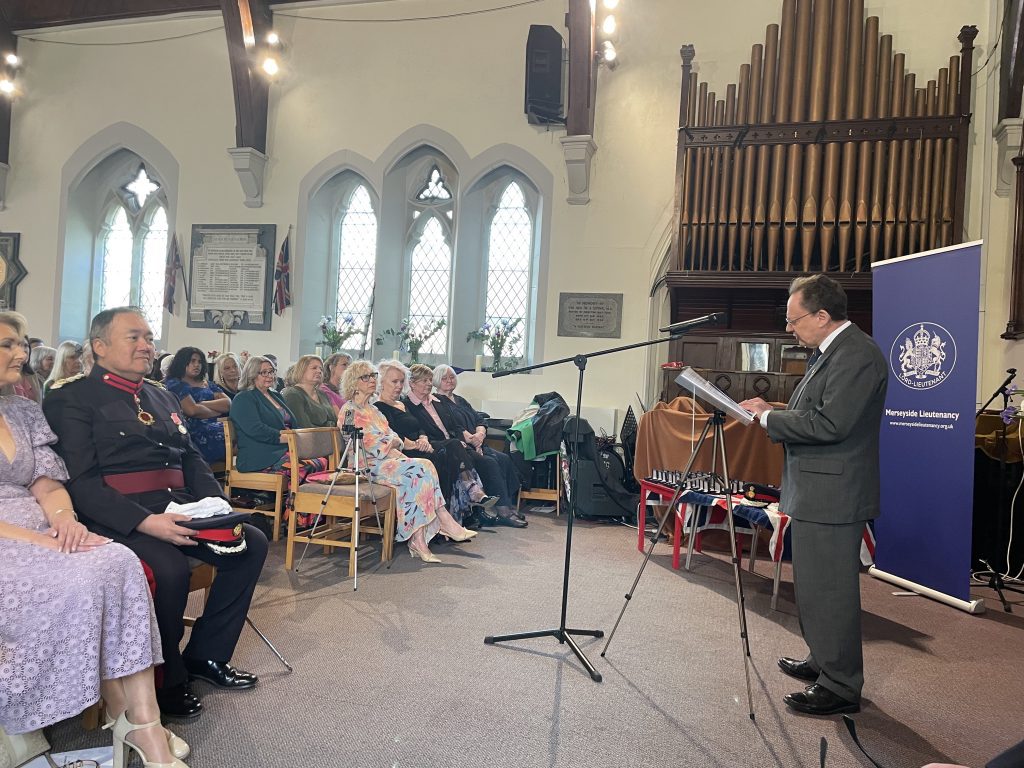 Many thanks to the Mayor of Wirral, Cllr Brian Kenny and Mayoress Mrs. Helen Kenny, Assistant Director Wirral Council, Mr. Peter Moulton and Rector of Christ Church, Revd Ron Ives for hosting the presentation in the beautiful Christ Church in Moreton. Also pictured is the High Sheriff of Merseyside, Mr. Billy Hui BEM DL and consort Ms Kerry Berrisford, Alison Holmes of Moreton in Bloom making her response and Sue Higginson OBE DL.